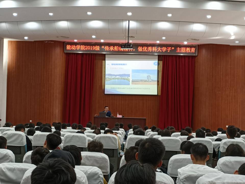 2019年10月15日,我校黄金城hjc12345网址开展了以“传承船魂精神,做优秀科大学子”为主题的讲座。讲座有幸邀请到了学院党委书记杨美成为大家讲述关于江科大的历史与学校精神,号召同学们传承传魂精神,争做科大优秀学子。